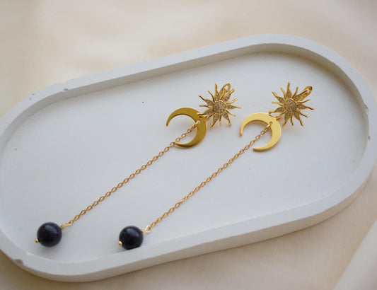 Aventurine Sun & Moon Long Chain Earrings – Golden Celestial Jewelry