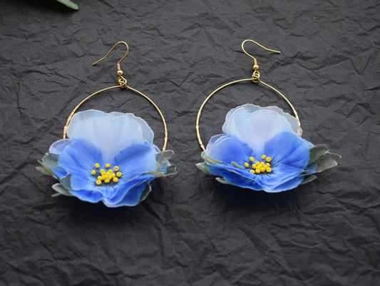 Blue Silk Pansy Hoop Earrings