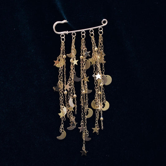 Celestial Star & Moon Brooch – Gold Chain Cosmic Lapel Pin Jewelry Gift