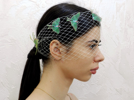 Embrace ethereal beauty on your special day with our Luna Moth Bridal Veil. Handcrafted with care, the design features delicate luna moth wings, adding a whimsical, nature-inspired element to your look. The birdcage style beautifully frames the face, offering a vintage yet enchanting allure. Ideal for woodland weddings, boho brides, and free spirits, this silk accessory is a captivating alternative to traditional veils. Let your love story soar with this unique piece.