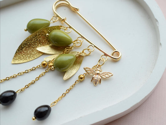 Olive Branch Brooch with Bee Charm – Gold Leaves and Beaded Lapel Pin