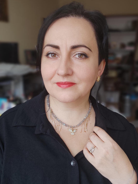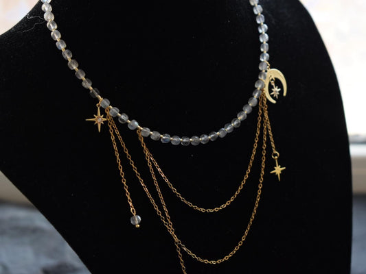 Labradorite Asymmetrical Choker Necklace with Moon Pendant – Elegant Gold Chains Jewelry Gift for Women